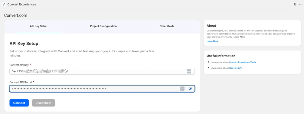 The Shopify app connects securely to Convert using API credentials.