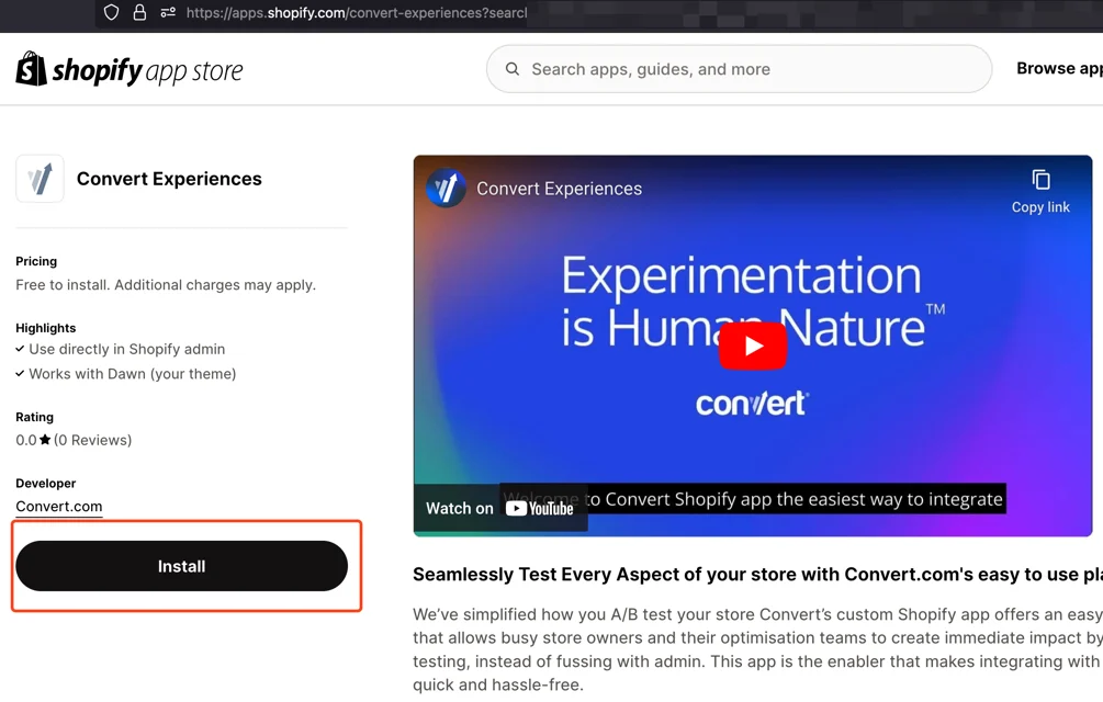 Install the Convert Experiences app from the Shopify App Store.