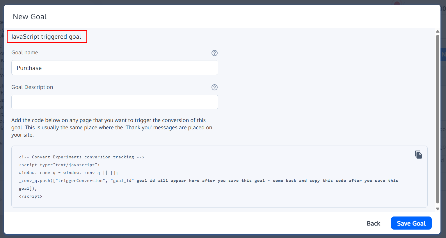 - Create goals as JavaScript-triggered goals